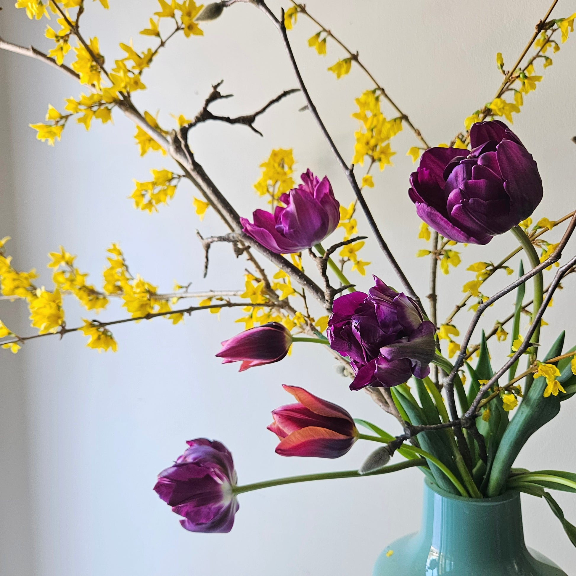 A mix of our finest specialty tulip varieties plus local greens and branches in a vase! Each arrangement is unique and colors & varieties will vary.